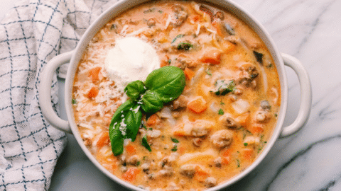This soup has all the flavors of lasagna without all the work – caramelizing the tomato paste with the sausage creates that deep, rich taste that makes it special. The pasta and cheese make it feel like you’re eating actual lasagna, just in soup form.