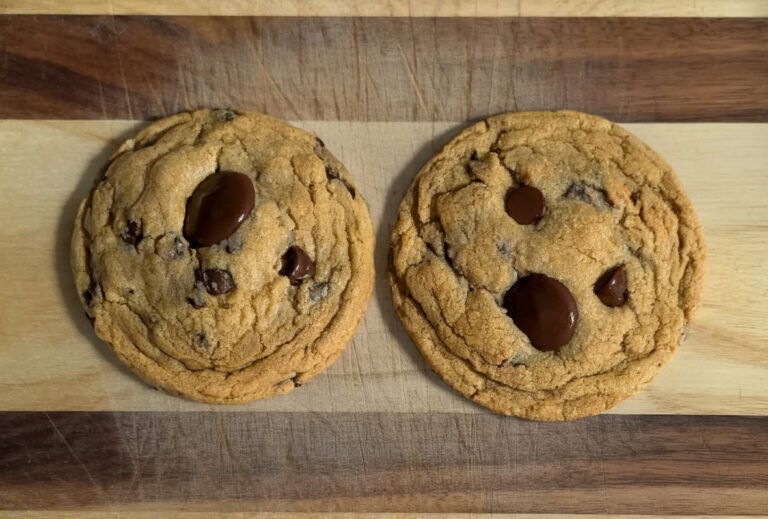 These are classic chocolate chip cookies with crispy edges and a chewy, gooey center. This version uses softened butter, not brown butter, and is topped with flaky sea salt.