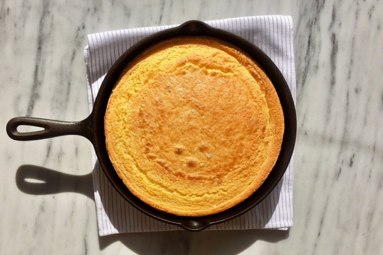 This cornbread has a moist, rustic crumb from stone-ground cornmeal and a hint of sweetness. It gets a perfect, crisp bottom crust from being baked in a preheated, hot cast iron pan.