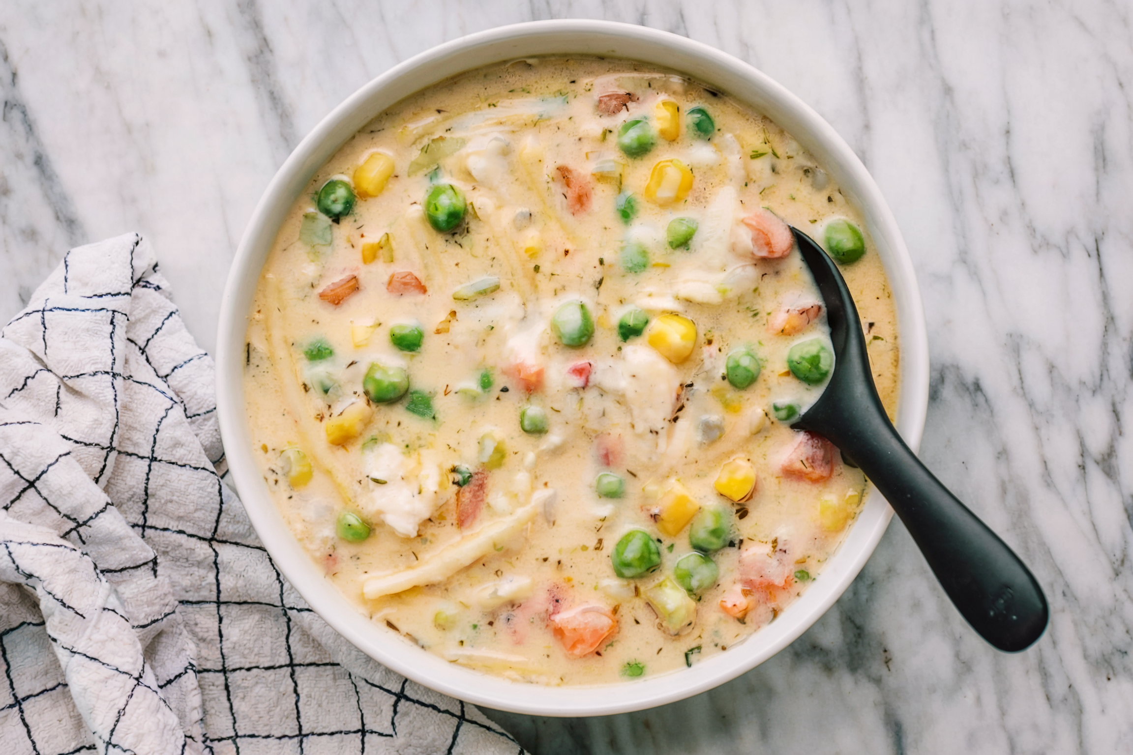 Stir in the frozen corn, frozen peas, and cooked chicken, and cook until everything is warmed through. Remove from the heat and season to taste with additional salt and pepper. Garnish with fresh parsley before serving.