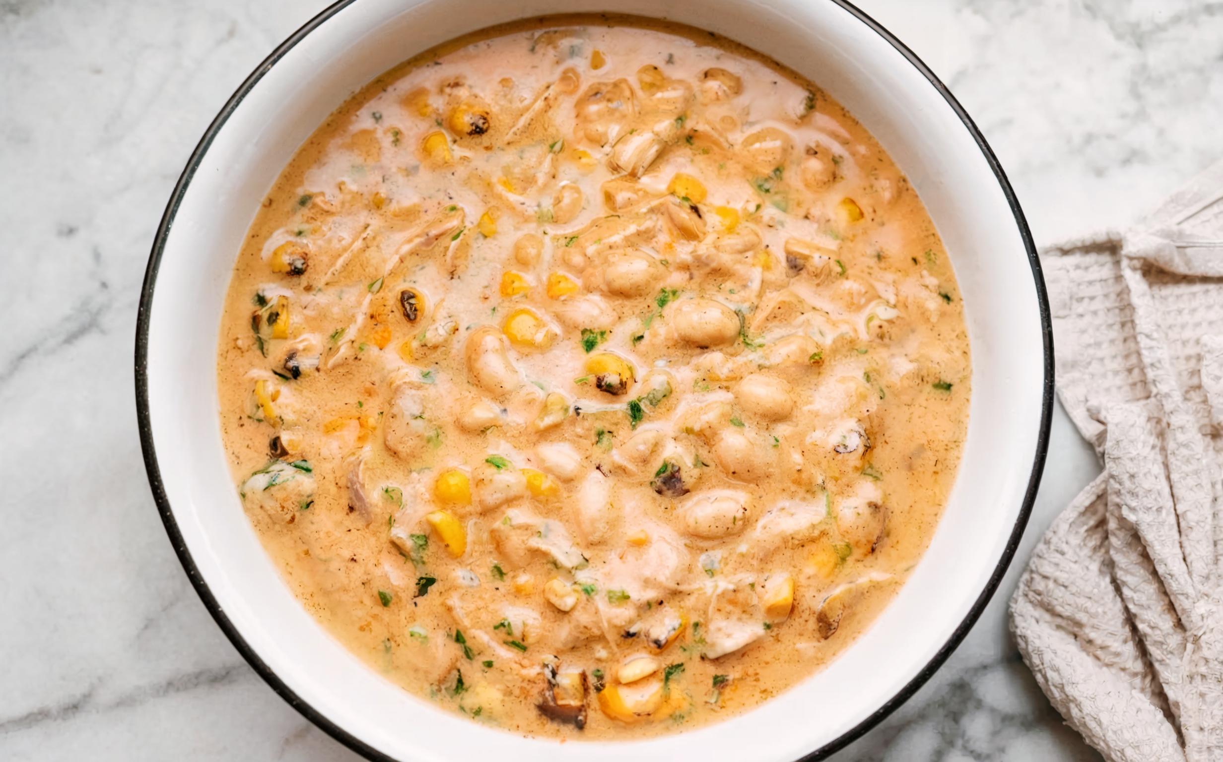 Place the chicken thighs, enchilada sauce, white beans, corn, green chiles, and all dried seasonings into a 6-quart slow cooker. Pour in the chicken stock and stir everything to combine, making sure the chicken is submerged.