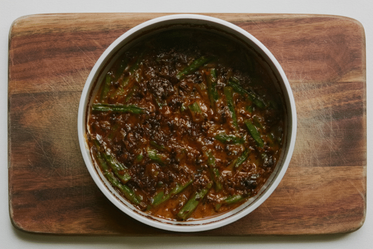 In a large bowl, combine the blanched green beans, the mushroom sauce, and 1/2 cup of the crispy fried shallots.