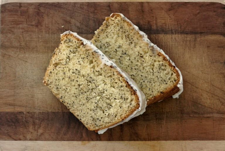 This is a soft, moist loaf cake with a bright lemon flavor and the crunch of poppy seeds. It’s finished with a simple lemon glaze.